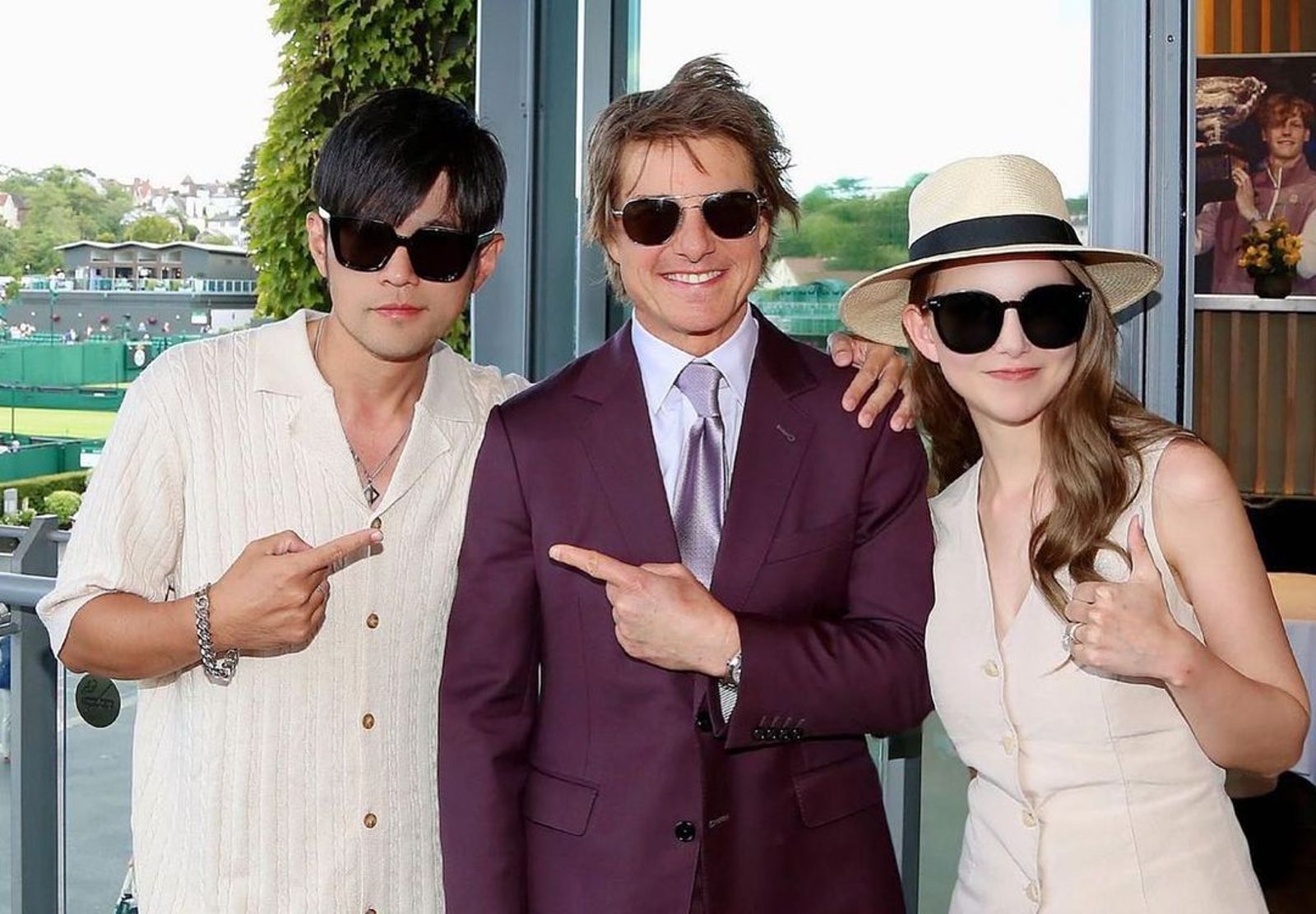 周杰倫週日(14日)與昆凌受勞力士邀請,到場觀看溫網男單決賽,比賽結束後與勞力士總裁Jean-Frederic Dufour用餐,席間阿湯哥也在。周杰倫今在IG貼出夫妻與阿湯哥的合照,可見穿紫色西裝的阿湯哥在站在中間,被周杰倫勾肩,兩人還用手指著對方,昆凌則在右邊比讚。