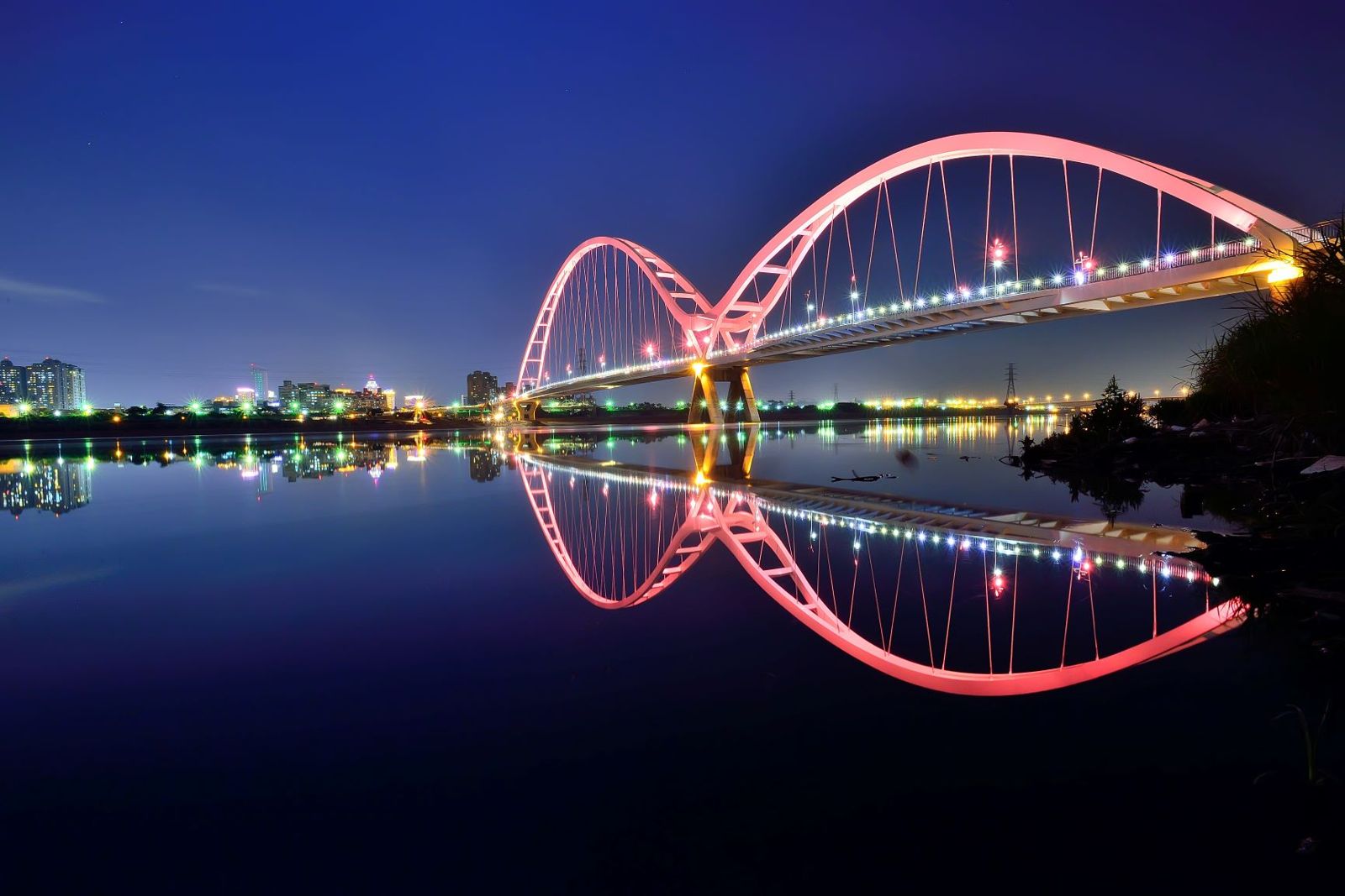 新月橋重啟光雕,知名橋梁與水面倒影再現。(謝佑欣攝影,新北市高灘處提供)