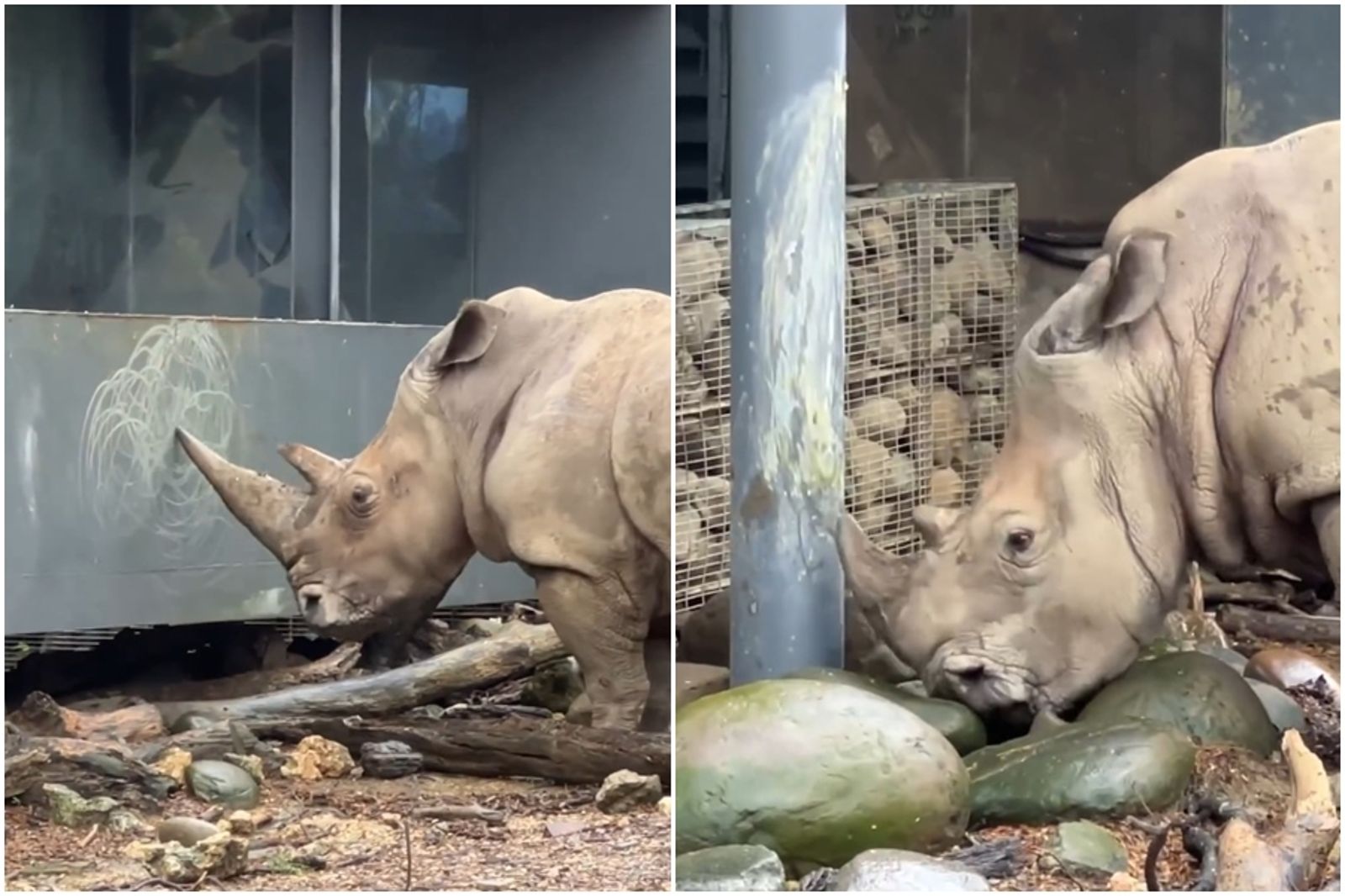壽山動物園PO出犀牛磨角的日常影片並寫下,「鐵杵都快磨成繡花針啦…展區裡的銅牆鐵壁、樹幹、水泥牆…全都磨過一輪…寶寶啊!妳是在塗鴉還是要報名牌呢?」