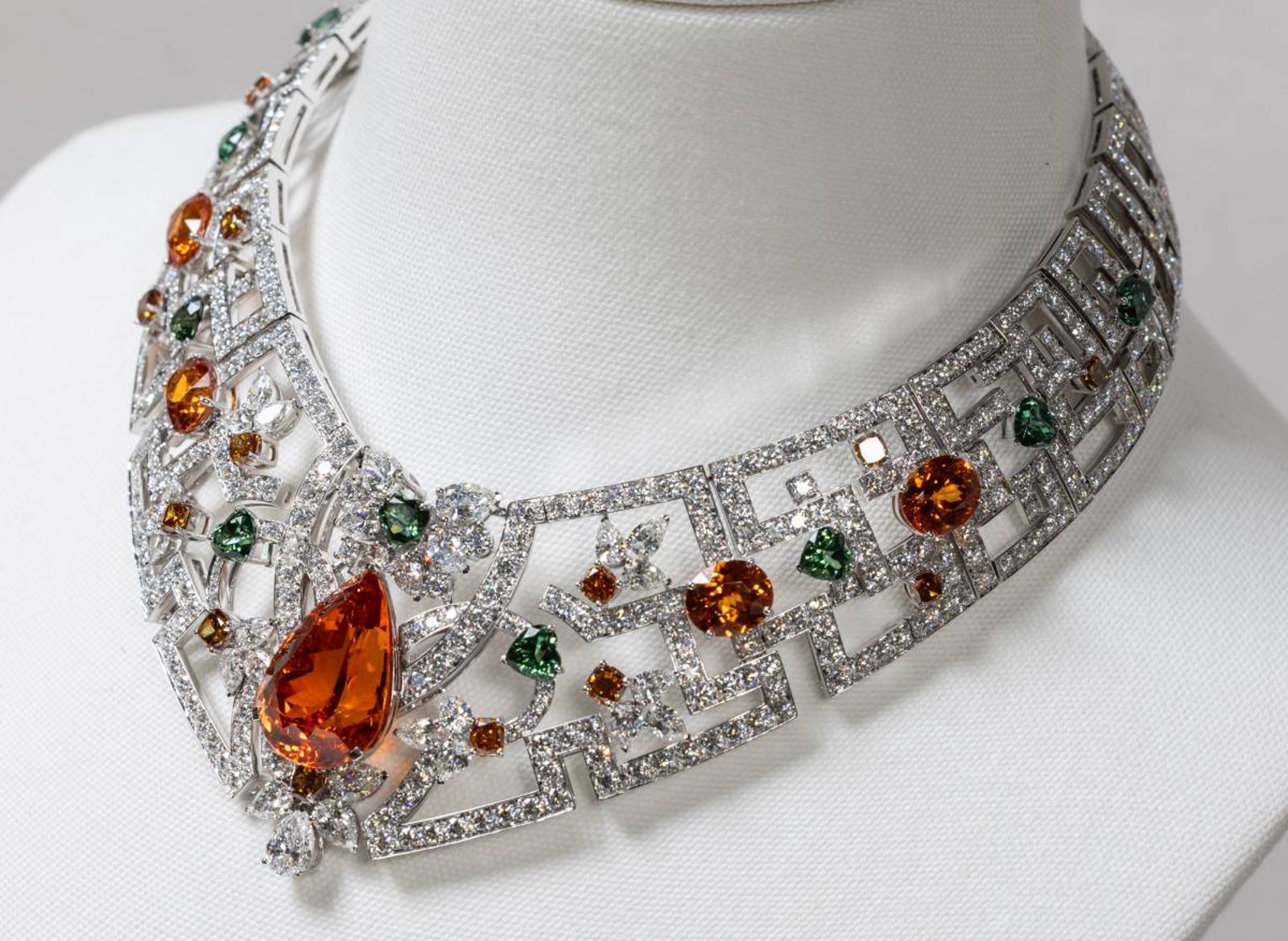 另外,義大利花園以其豐富的色彩和多樣的植物而聞名,Labirinti 系列也完美地捕捉了這種繽紛。以超大克拉的寶石,例如碧璽、蛋白石和橘色石榴石交織出繁花盛開的景象;其中有一顆重達 53.25 克拉的「湖水綠碧璽」為主石的項鍊,周圍環繞著凸圓面蛋白石和枕形切割橘色石榴石,再配以一顆19.68克拉衣索比亞蛋白石,綻放出令人目眩神迷的光芒。