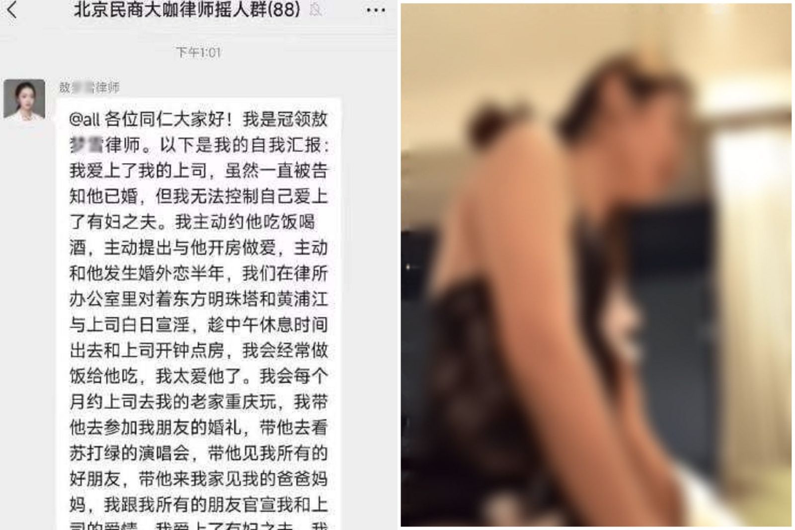 近日中國律師界瘋傳一段文字,內容為這名敖姓女律師自爆,承認自己當了上司的小三,並曝光兩人大尺度的淫穢行為,內容寫道:「我愛上了有婦之夫,我們超愛在床上做愛,我每周都會和上司出去開房......我超喜歡給上司當性奴。我一直想給所有同事朋友官宣我們的愛情,我的上司說他會為了我離婚,他每天都會說愛我愛到死,我的身體超敏感......他對我欲罷不能,我們在一起超快樂,我們超享受甜甜的戀愛。」