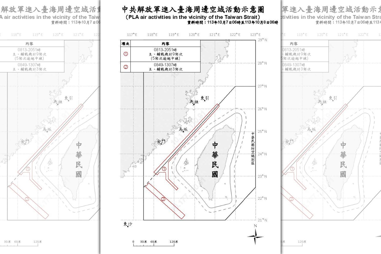 國防部今(8日)指出,自昨(7日)6時至今日6時止,偵獲共機12架次與共鑑7艘次持續在台海周邊活動,其中逾越海峽中線及延伸進入西南空域有8架次共機。對此,國軍用運任務機、艦及岸置飛彈系統嚴密監控與應處。 此外,國防部今日也預告,10月10日中華民國國慶時,中共將於西昌衛星發射中心往西太平洋發射運載火箭,將經過我國防空識別區(ADIZ)。 國防部昨日表示,自6日6時至7日6時止,偵獲共機27架次與共鑑6艘次持續在台海周邊活動;其中逾越海峽中線及延伸線,進入北、中部與西南空域有19架次共機。