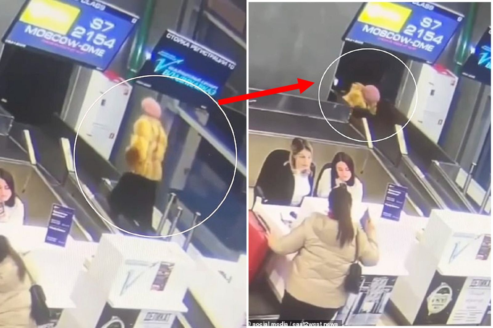 據英國《每日郵報》報導,從監視器畫面可見,當時別斯蘭機場內西伯利亞航空S7 2154班機櫃台,正在辦理登機手續,大媽也在此辦理,她所搭乘的班機準備飛往莫斯科多莫傑多沃國際機場(Domodedovo airport)。只不過,大媽在櫃台辦完手續後,疑似把行李輸送帶的入口,誤認成是通關走道,隨後大媽就直接站在輸送帶上,過不久大媽跌倒,整個人就變成行李,躺進行李輸送區域內。