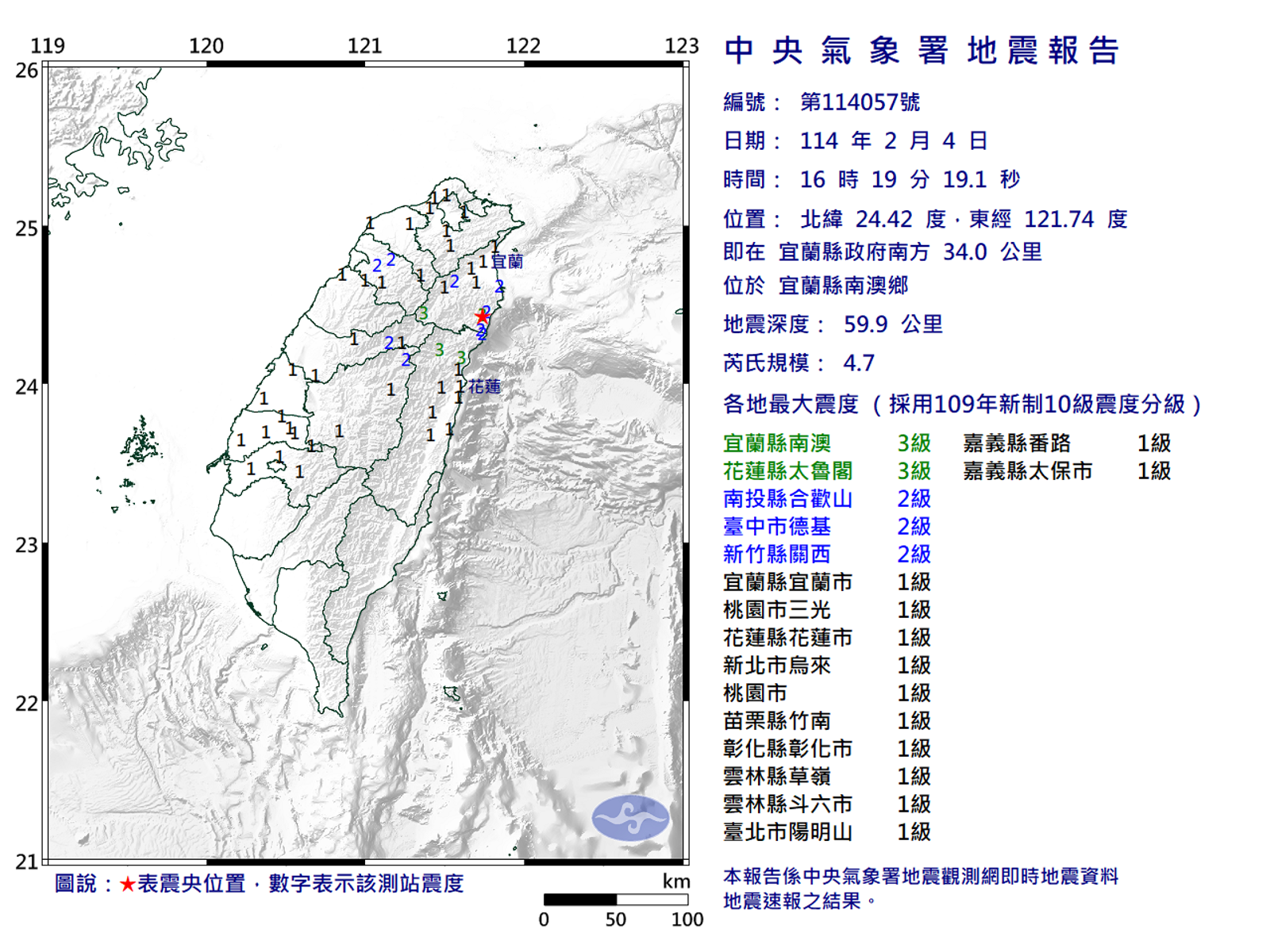 農曆年期間南部地區不斷發生有感地震,今天下午突然又地牛翻身,震央位於北緯24.42度,東經121.74度,即在宜蘭縣政府南方34.0公里 ,位於宜蘭縣南澳鄉。 這起地震宜蘭縣、花蓮縣地區最大震度達3級;南投縣、台中市及新竹縣最大震度達2級;桃園市、新北市、苗栗縣、彰化縣、雲林縣、台北市及嘉義縣最大震度則為1級,不少地方都能明顯感受到搖晃。