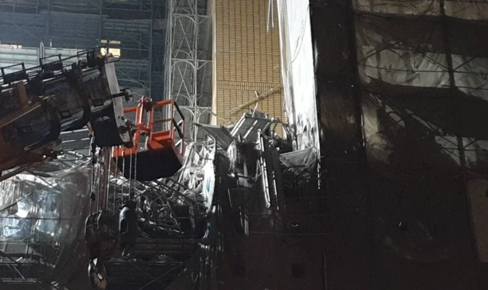 台大醫院工地鷹架昨日發生倒塌,今日凌晨在鷹架堆中尋獲失聯移工遺體。(翻攝畫面)發布時間:2025.04.22 09:34 臺北時間