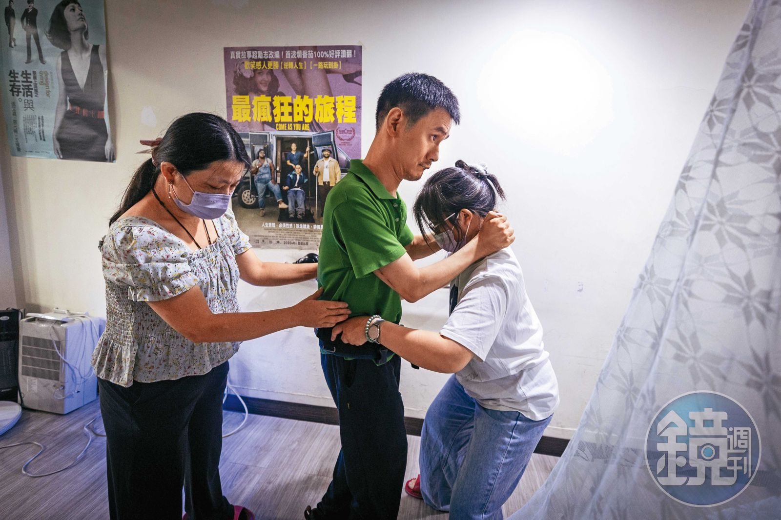 下午時分我們到他的住處。這天他正在做復健,有物理治療師幫忙他行走,也有個助協助他上廁所。孫嘉梁很熱情,示範如何自己用電鍋蒸飯,還請個人助理小文代替他,向我們介紹他床上的一個洞。這個洞連接尿桶,他睡覺時會穿上開洞的褲子,想尿尿時,就翻身對準床上的洞。