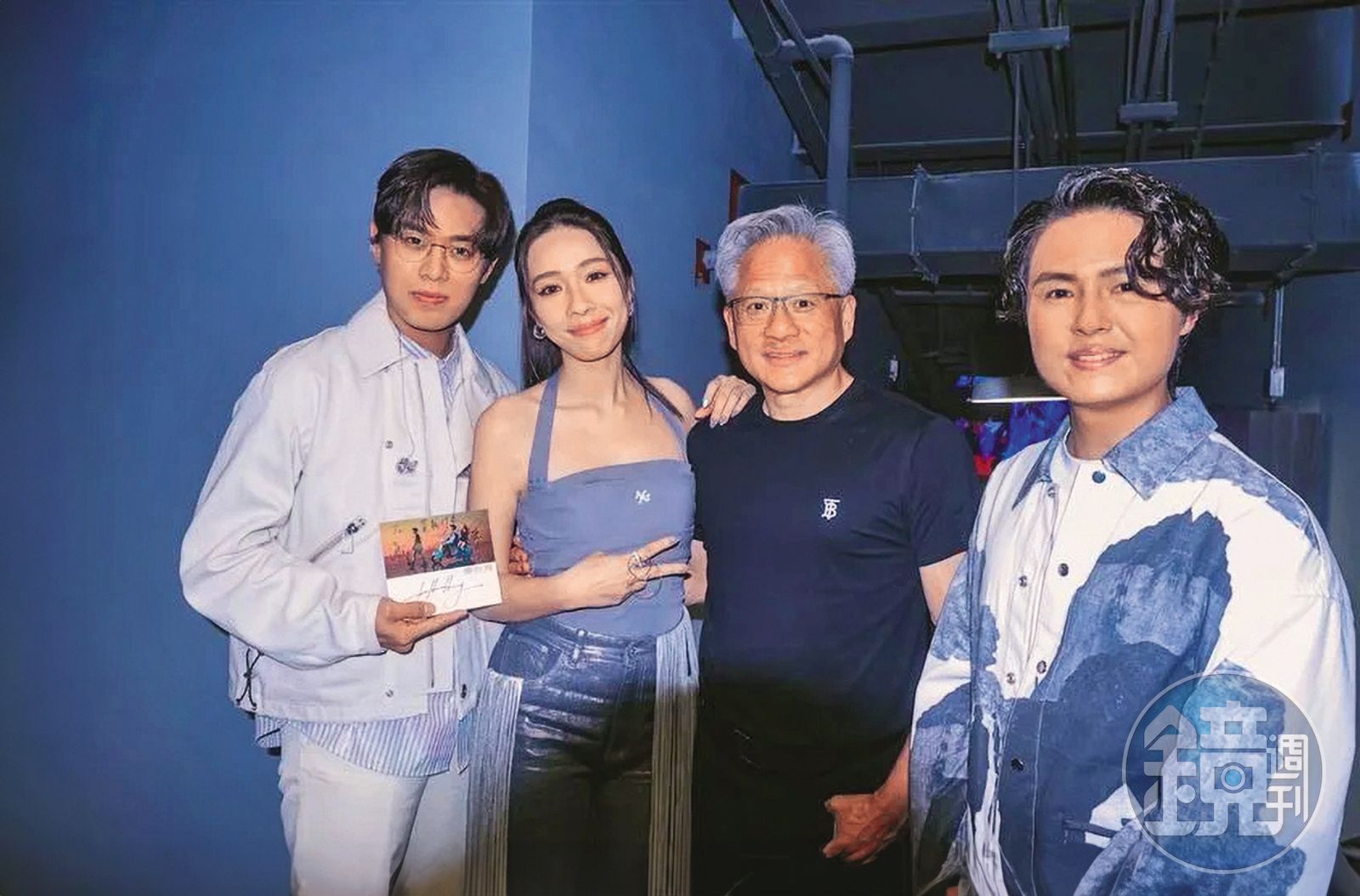 告五人為世壯運獻唱,在後台補獲「AI教父」黃仁勳(右二)。(相信音樂提供)發布時間:2025.05.25 05:28 臺北時間