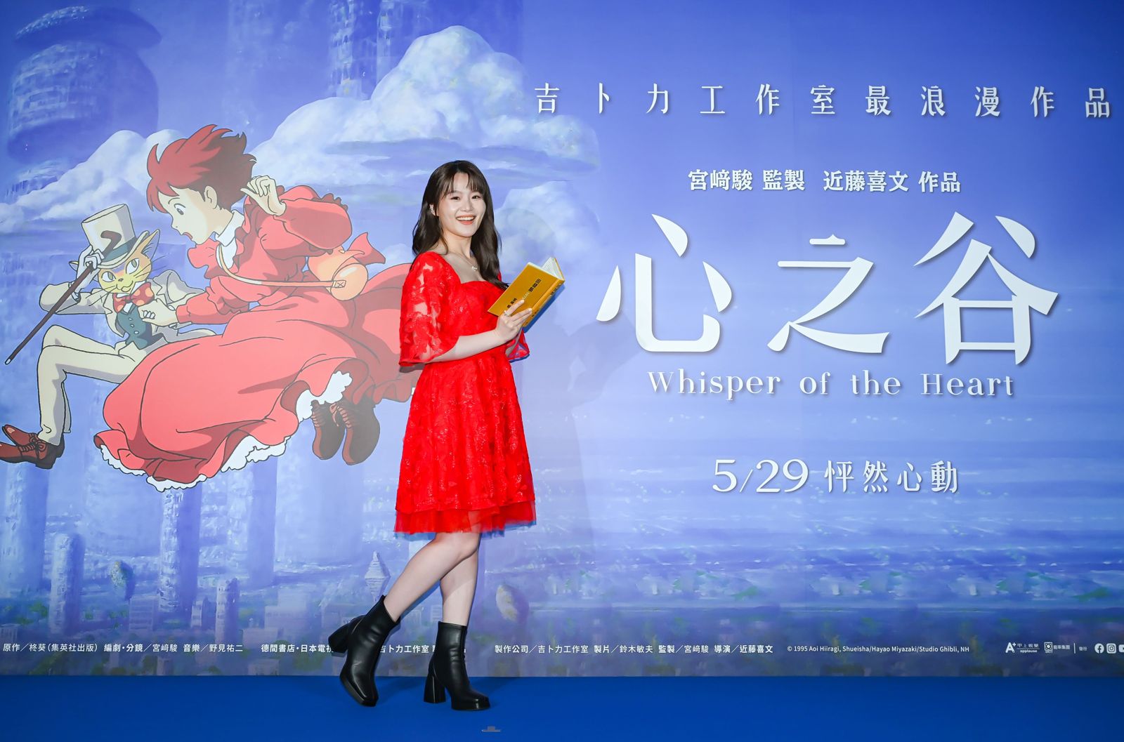 由宮﨑駿監製、編劇的經典動畫《心之谷》將於5月29日重返全台大銀幕,中文配音演員楊小黎27日cosplay主角「月島雯」現身首映會,穿著紅色洋裝亮相,與學生樂團合影時憶起13歲配音時的心情,笑說片中天澤聖司是她的「初戀男友」,還曾為他在錄音室爆哭。