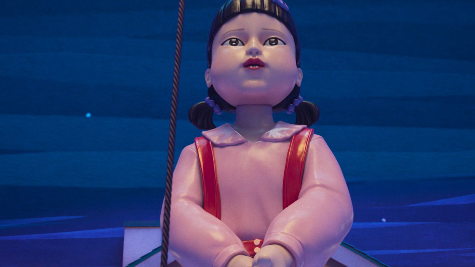 預告以陰森童謠「咚咚,請問是誰啊?我是小乖乖」揭開序幕,象徵恐怖遊戲即將開啟。巨型英熙娃娃再度現身,多位參賽者驚恐地躲藏在她巨大的雙腿後,童年記憶再次轉化為生存惡夢。主角成奇勳(李政宰飾)崩潰吶喊:「為什麼不殺我?為什麼只留我活口?」反映出他因背叛而深陷的罪惡與煎熬。