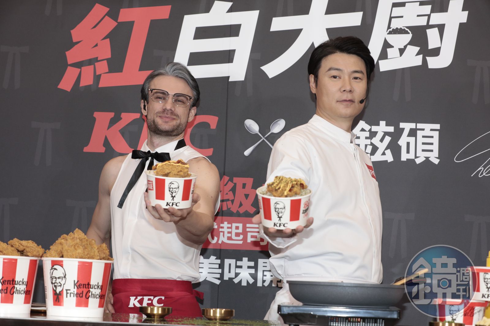 崔鉉碩在記者會上與象徵肯德基爺爺的猛男同台,並現場製作〈韓式起司脆雞飯〉,崔主廚帥氣熟練的顛鍋手法讓白飯與雞汁完美融合,也獲得全場尖叫,讓他露出滿足笑容。最後還再以招牌姿勢撒上洋香菜葉,完美完成這道主題美食。