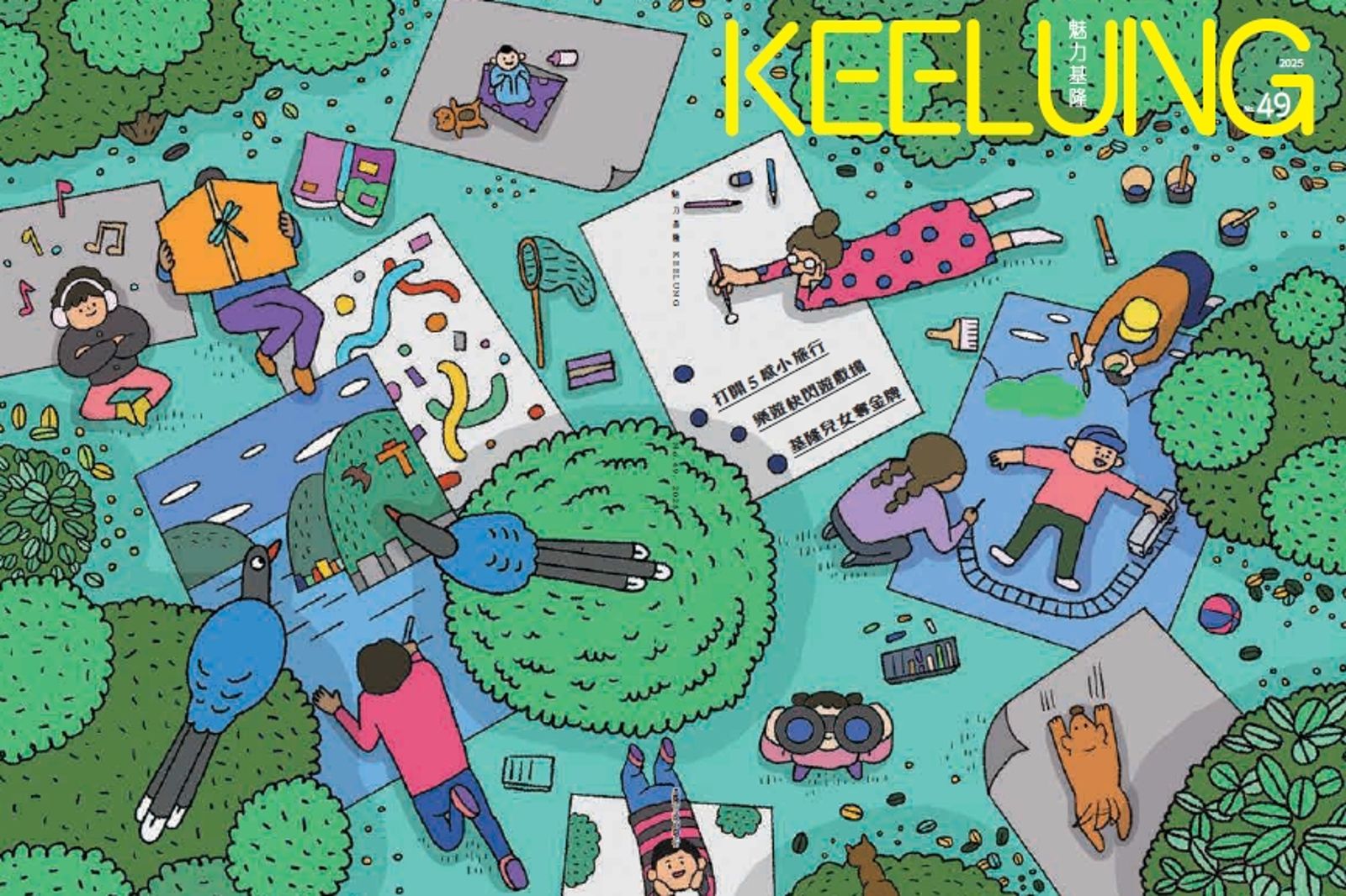 本期的主視覺設計,邀請基隆插畫家葉雨涵以黑鳶為敘事軸線,運用其獨特的筆觸與想像力,從空中鳥瞰的角度,描繪出孩子與家長齊聚國門廣場,色彩斑斕,情感真摯。基隆小旅行地圖也將【基隆好遊趣】單元推薦景點以童趣的筆調描繪出來。