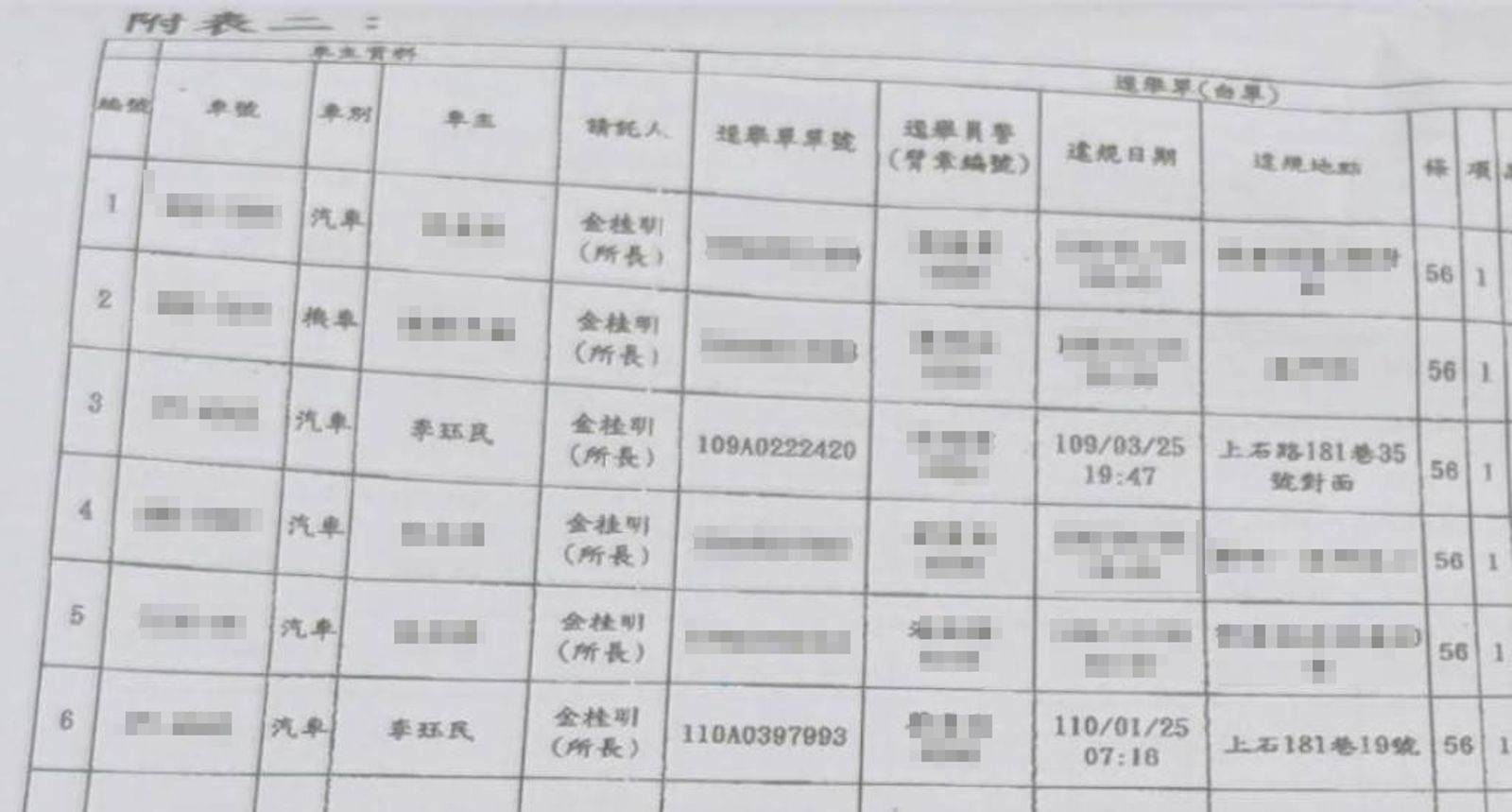 根據台中地檢署起訴書,現任台中市警局公關室主任李玨民,曾於2020年3月25日、2021年1月25日,在台中市西屯區上石路巷弄違停汽車被開白單,應各罰900元;原任主任祕書室專員的林志勇,於2019年1月1日在西屯區逢大路違規停車,應罰900元。這3單最後卻以「記憶卡無法讀取」、「照片銷毀」等理由免罰。