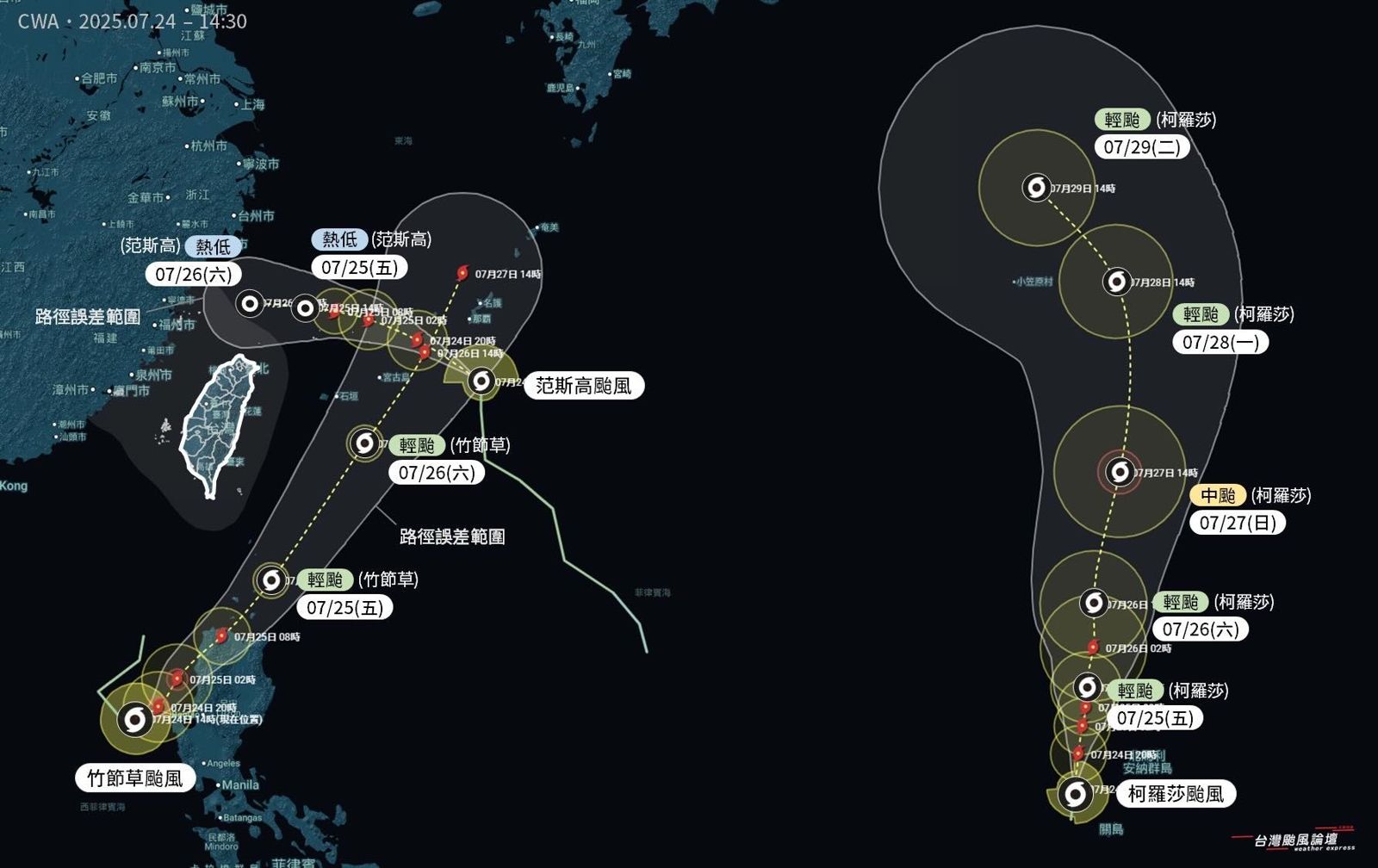中央氣象署今(24日)14時指出,輕颱「范斯高」中央位置於北緯24.7度、東經128度,以每小時34公里速度,向西北西進行;輕颱「竹節草」中心位置於北緯16.3度、東經118.8度,以每小時12公里速度,向東北東進行;輕颱「柯羅莎」中心位置在北緯14.5度、東經143.8度,以每小時17公里速度,向北進行。