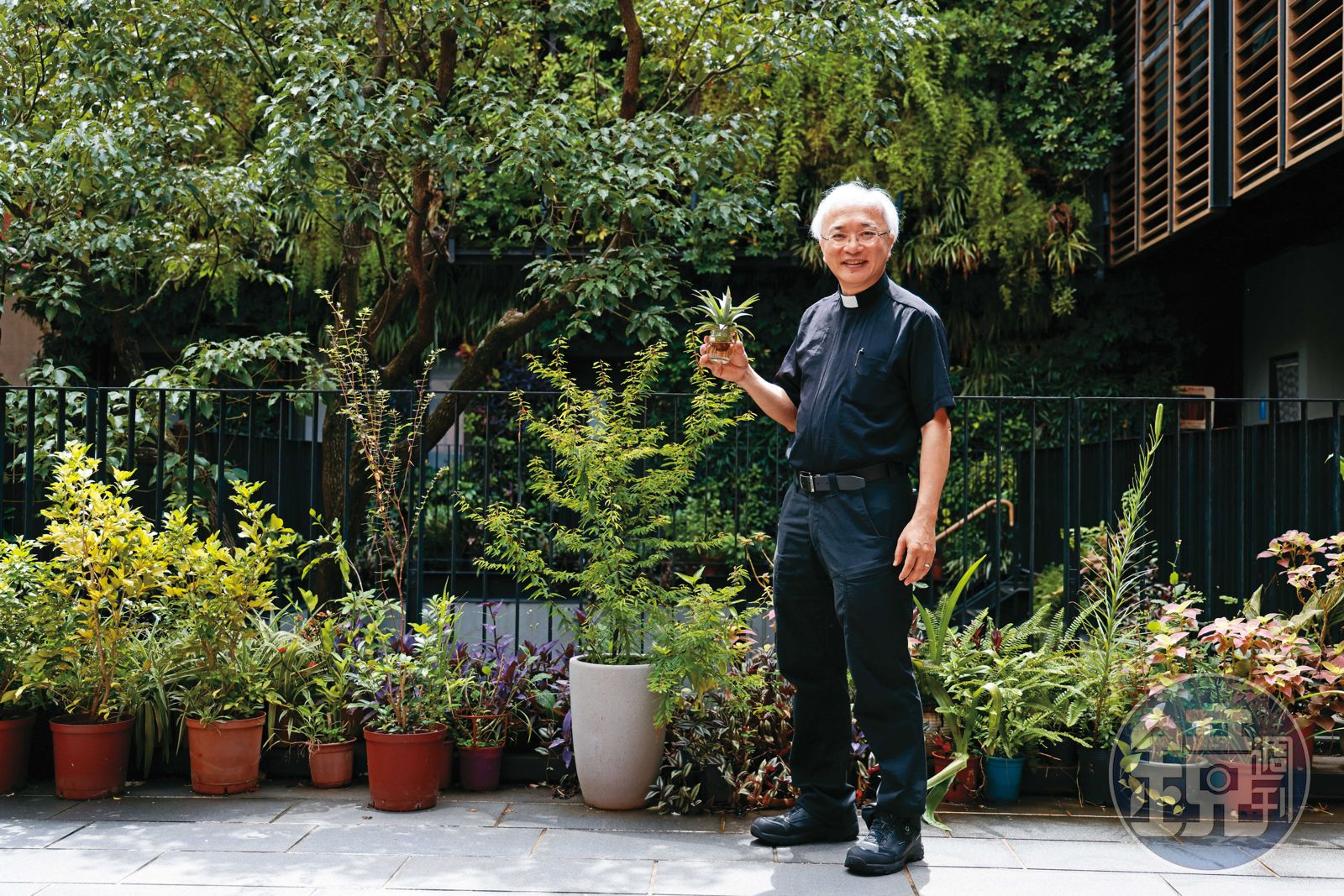 第一次見面時,黃春生穿著一身黑衣;到了第3次見面,他還是一身黑衣便服。問他這是牧師的服裝規定嗎?他說,他只是不想為挑選衣服花色傷腦筋。而這身全黑,更對比出頭頂的全白,事實上,他明年才滿60歲。