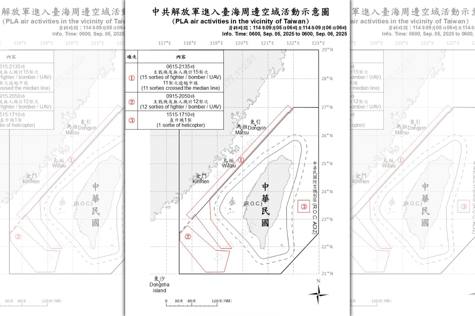 據國防部公布的中共解放軍進入台海周邊空域活動示意圖,昨6時15分至21時35分,中共出動主戰機及無人機15架次,其中11架次逾越中線,進入我北部及西南空域;9時15分至20時50分另有12架次戰機及無人機活動,範圍涵蓋西南及東南空域;15時15分至17時10分直升機1架次在東部外海活動。
