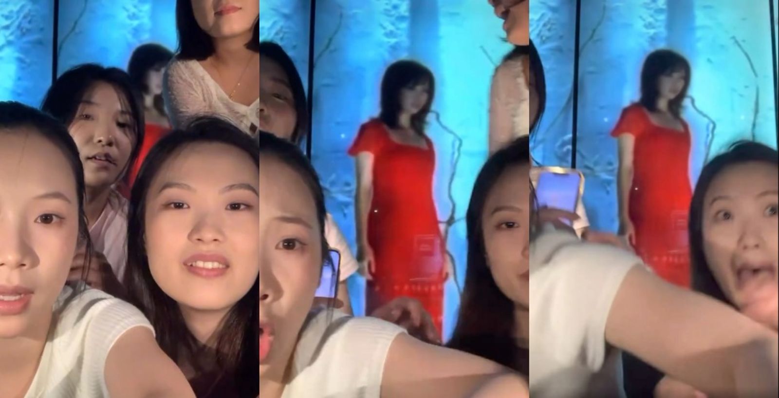 其實是張惠妹?影片中,女孩們點唱了張惠妹經典神曲〈聽海〉。就在她們對鏡頭擺Pose時,螢幕裡突然出現一位低頭的紅衣女子,嚇得全場驚聲尖叫。沒想到「紅衣女鬼」根本不是什麼靈異事件,而是MV裡的張惠妹!