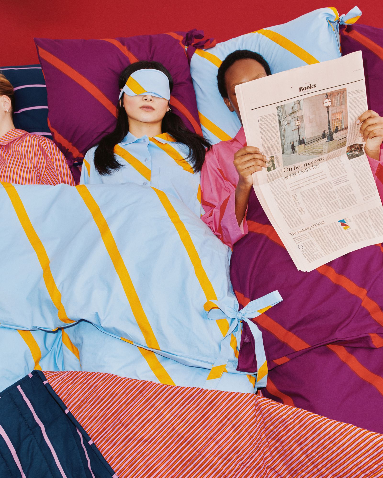這個想法趣味十足的系列,創作靈感源自「探索人們在床上所發生的各種日常」(all the things we do in bed.), Gohar選用Marimekko鮮明對比的條紋印花(印花藝術家Maija Isola的創作)讓這個系列成為既可在家、也能外出穿著的睡衣套裝,貼切展現了藝術家輕鬆自在的生活藝術,以及Marimekko充滿快樂與樂觀的品牌態度。