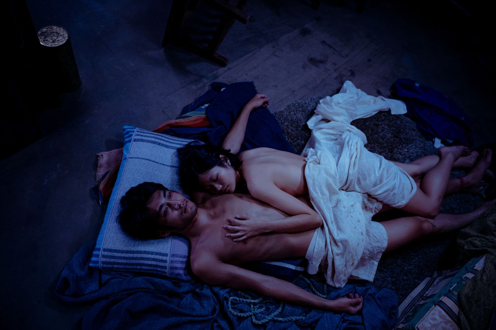 潘綱大與柯泯薰在片中挑戰多場露骨親密戲,不僅考驗默契,更直面角色的孤獨與掙扎,尤其最後的綑綁窒息性愛戲,將角色情緒推向極致。潘綱大分享,事前特別跟專業老師學習「束縛技巧」,考慮角色是個住在河邊、習慣手作的男子,打繩結應該要流露出平時熟悉的手法,都是從角色日常延伸出的細節。