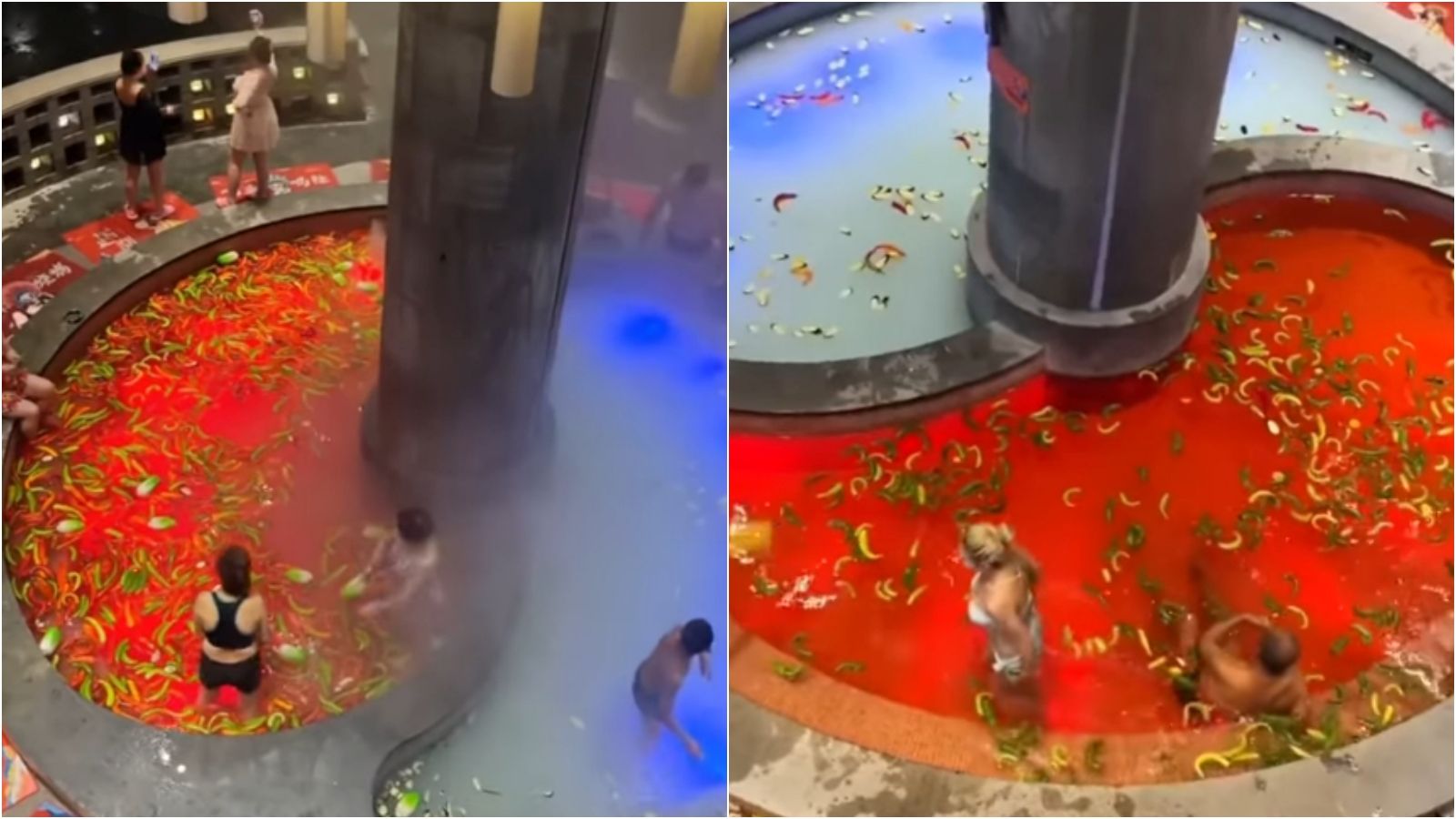 根據《TVBS》報導,1名網紅近日在IG發文,分享這間度假村的澡堂畫面,只見鴛鴦鍋造型的澡堂分成「白湯池」與「紅湯池」,裡面都放入各種辣椒,紅棗、檸檬等,看起來真的就是「火鍋湯底」。 不少網友紛紛留言,擔心會不會泡一泡傷到皮膚,還有人表示可能會使陰道或尿道灼痛,引發熱烈討論。 事實上,這個澡堂2年前就曾被質疑危險性,不過渡假村工作人員強調那個只是視覺效果,紅湯靠燈光,白湯則加入牛奶;看起來很辣的辣椒多為塑膠玩具,少部分是沒切開的真辣椒「不會辣」,並會重複使用,無浪費問題。