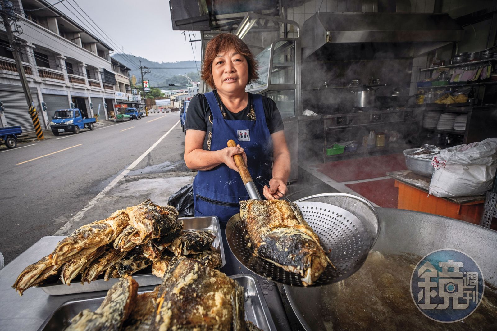 「出院剛回到店裡,我看到油都會怕,但還是穿防護衣硬著頭皮炸,但實在太熱了!」心疼太太的羅吉鎮於是接手炸魚工作,這幾年他因膝關節手術無法久站,江明苓才又再接手。10多年前,長子江俊毅、次子羅偉壬陸續讀完書回到店裡幫忙。「老大被我調教的步調比較快,這幾年都給他掌廚,老二跟我老公一樣,都是慢郎中,只能當助手。但炸魚太危險、又要早起,我還是自己做。」